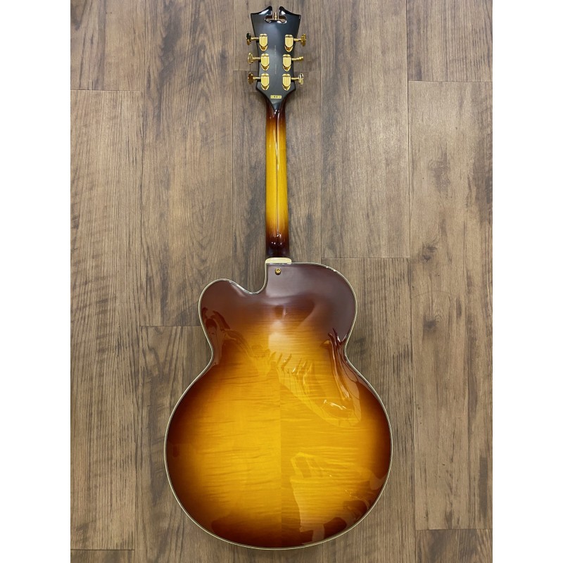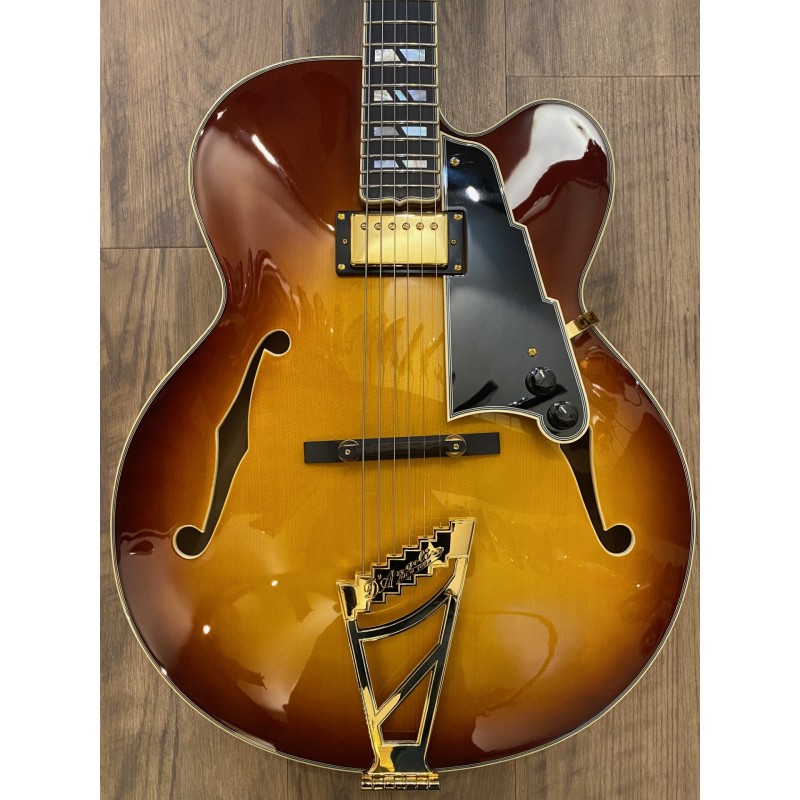 Forme Hollow Body avec pan coupéTable en épicéa laminéFond et éclisses en érable flammé laminéManche en érable/noyer/érableTouche en ébèneRepères blocs splittés en nacreProfil du manche en CFilet de corps 7 plisDiapason: 648 mmLargeur au sillet: 43 mm22 frettes1 micro double bobinage Seymour Duncan 591 réglage de volume1 réglage de tonalitéChâssis Jack EG2PPickguard 5 plis noirCordier D'Angelico StairstepMécaniques Grover 150 ImperialAccastillage doréCouleur: Dark Iced TeaEtui rigide incl.