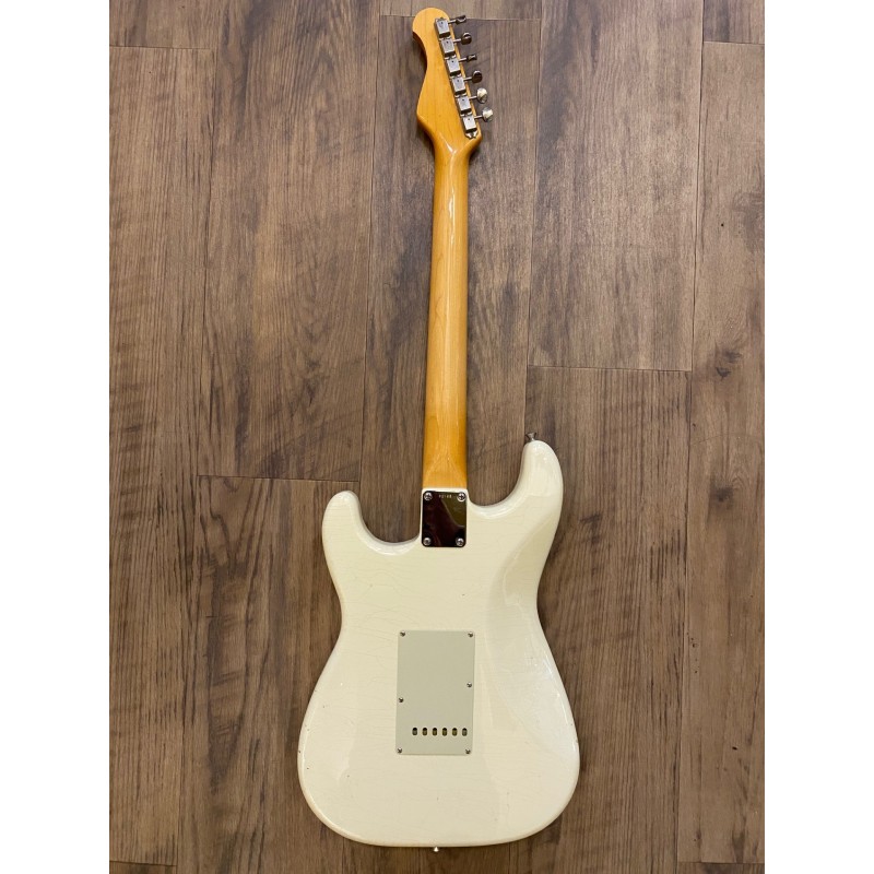 Corps 2-piece AbachiCouleur Vintage WhiteFinition NitrocelluloseVieillissement LightManche ÉrableTouche Palissandre indienProfile C-shapeRadius 9,5"Frettes 6105Mécaniques Kluson Double-LineMicros Apollo Pickups S-styleSélecteur 5 positions, Oak GrigsbyPotards 250 kΩ, CTSCondensateur 0,047 µF MustardPickguard 3 plis Vmint greenChevalet Del-Tone Vintage StyleÉtui rigide Del-Tone vintage style hardcasePoids : 3.2 kg