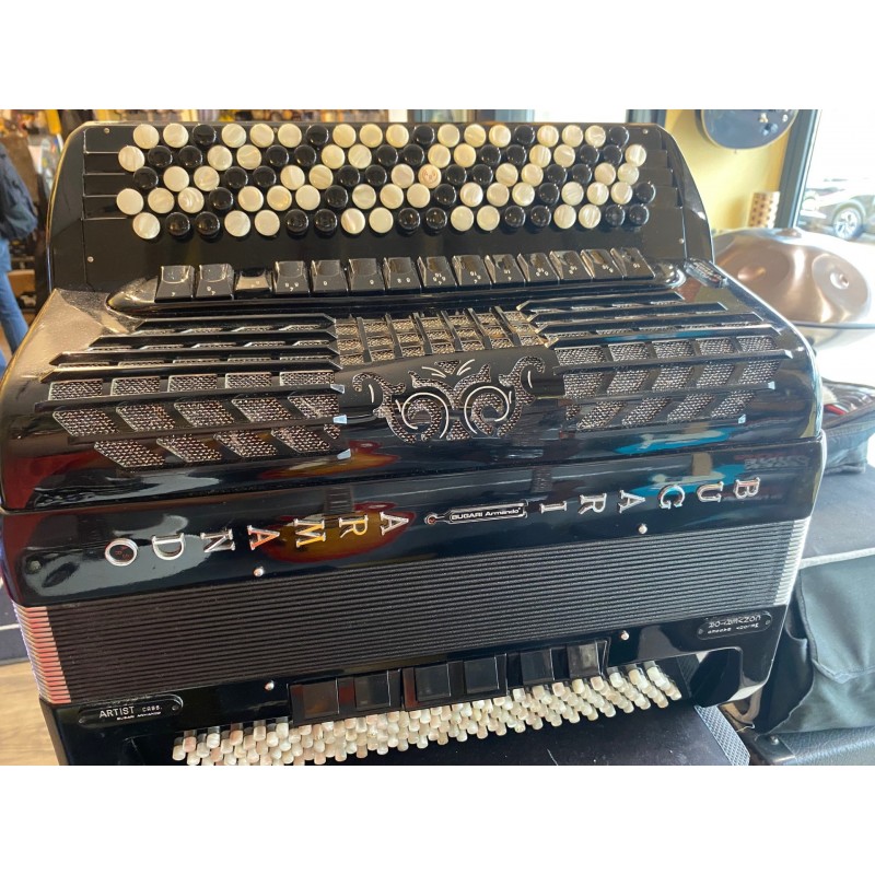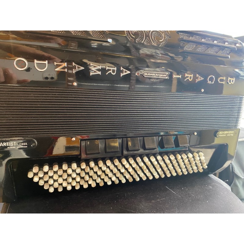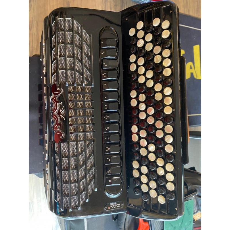 Main droite49 tones, 81 boutons, 5 rangs, système doigtè C7 registres3 voix, Octave (16+8+8)Main gauche120 basses standard3 registres 4 voixCouleur: noirDimensions: (haut.-long.-larg.) 46 x 42 x 20 cmPoids :10,30 kg