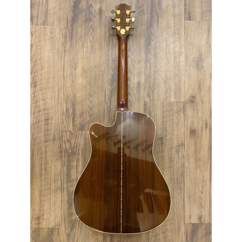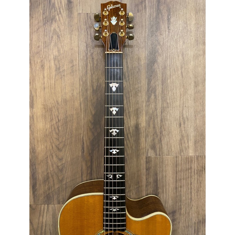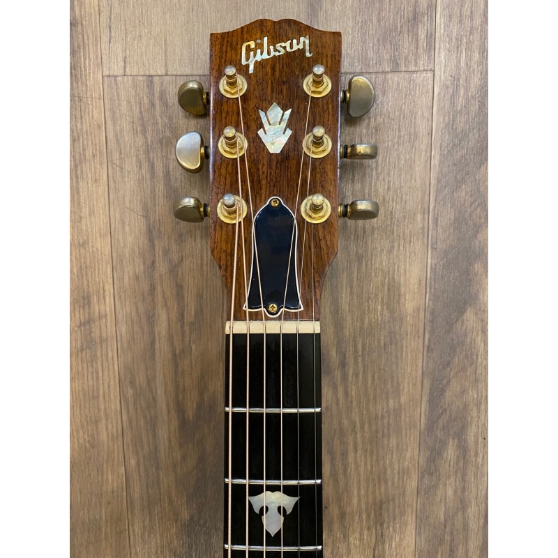 Forme DreadnoughtTable en épicéaFond et éclisses en palissandre indienManche acajou massifTouche ébeneRepères en nacreDiapason: 645 mm Largeur au sillet: 43 mm (Sillet de tête en Tusq blancRosace multi-bandes plus nacre20 frettesSystème de micro FishmanPickguard imitation écaille de tortueChevalet en ébeneSillet de chevalet compensé en Tusq blancMécaniques Grover GoldCordes Elixir 12-53Couleur NaturelEtui GibsonFabriquée a Buseman, Montana U.S.AAnnée 1999