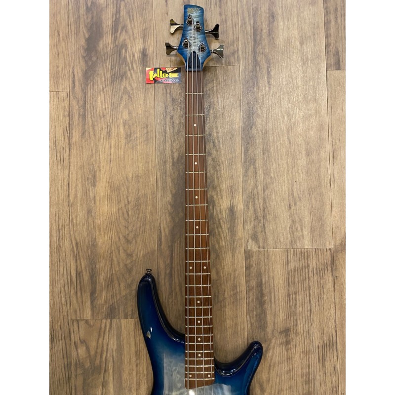 Corps en nyatohTable en érable mouchetéManche 5 pièces vissé en érable/noyerTouche en jatobaRepères "points" blancsRayon de la touche: 305 mm (12")Diapason: 864 mm (34")Largeur au sillet: 38 mm (1,5")Sillet en plastique24 frettes Medium2 micros double bobinage PowerSpan Dual CoilElectronique Ibanez Custom avec EQ 3 bandesContrôles: Volume, Balance, Bass, Middle, TrebleSélecteur "Power Tap" 3 positionsChevalet Accu-cast B300Mécaniques IbanezCordes D'Addario XL165Accastillage Cosmo BlackCouleur: Stained Cosmic Blue Starburst
