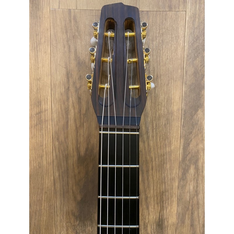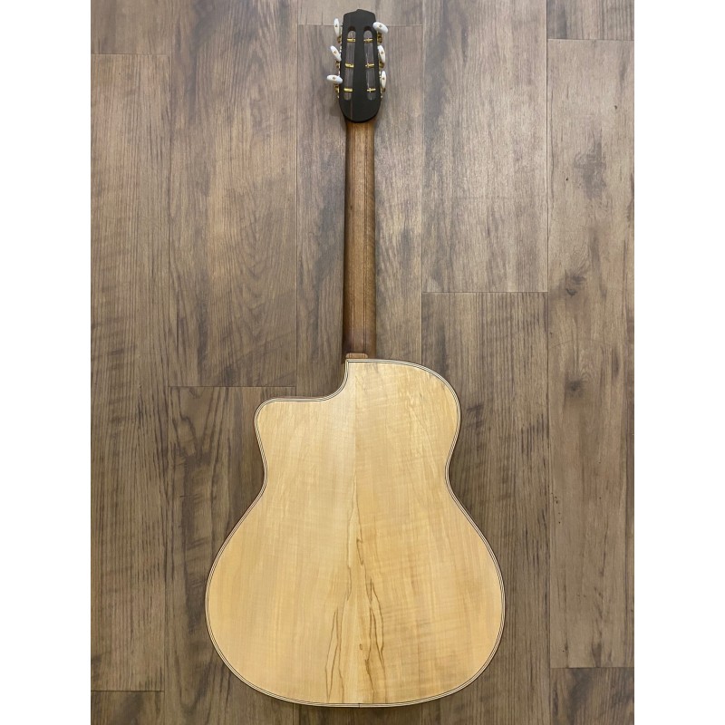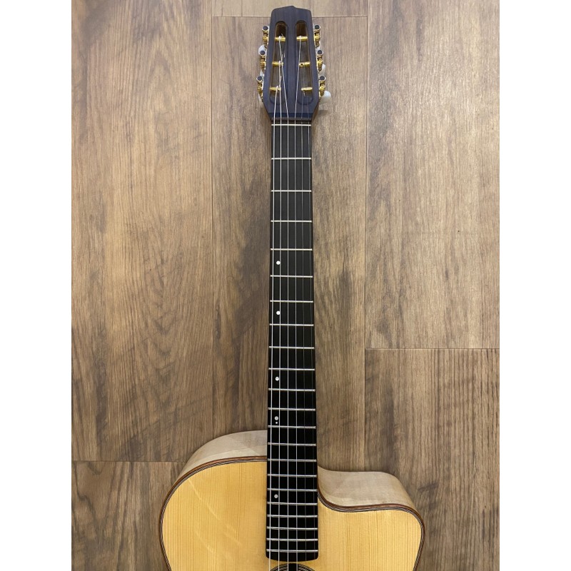 Table épicéa "griffes d'ours"Fond et éclisses érable ondé/figuré massif Manche multiplis noyer/acajouTouche ébène (radius 16'') Placages de tête palissandre et ébèneChevalet et moustaches ébène de macassarFinition huiléeDiapason 660mmCordier Kily Nonis Mécaniques type Schaller