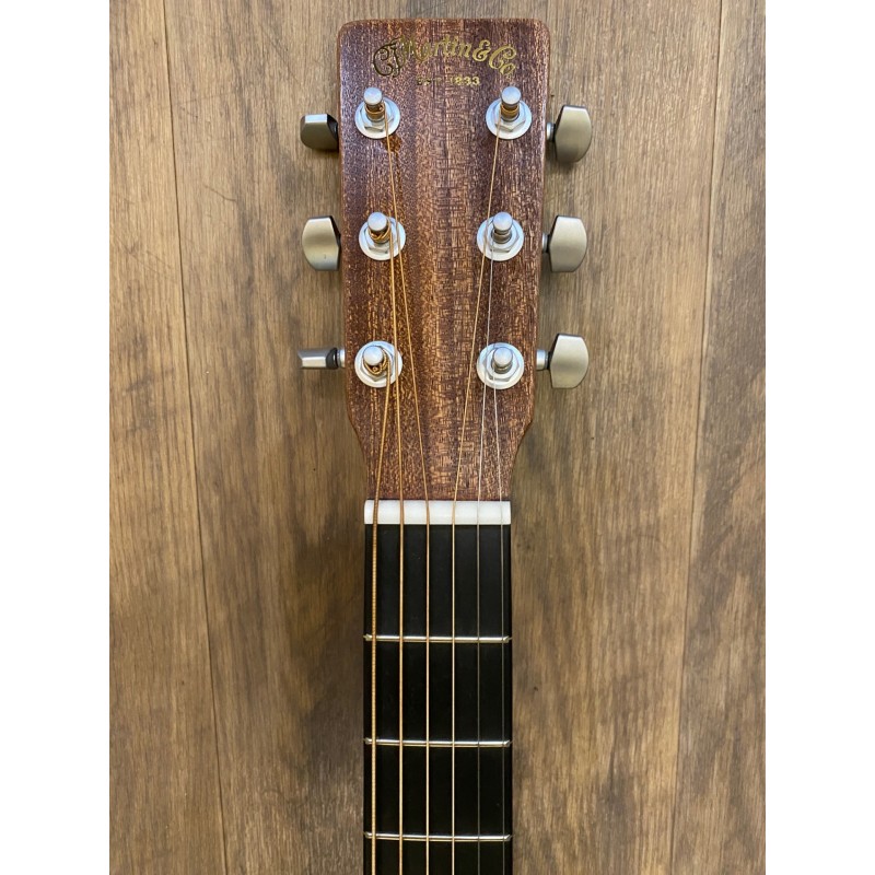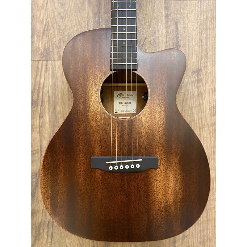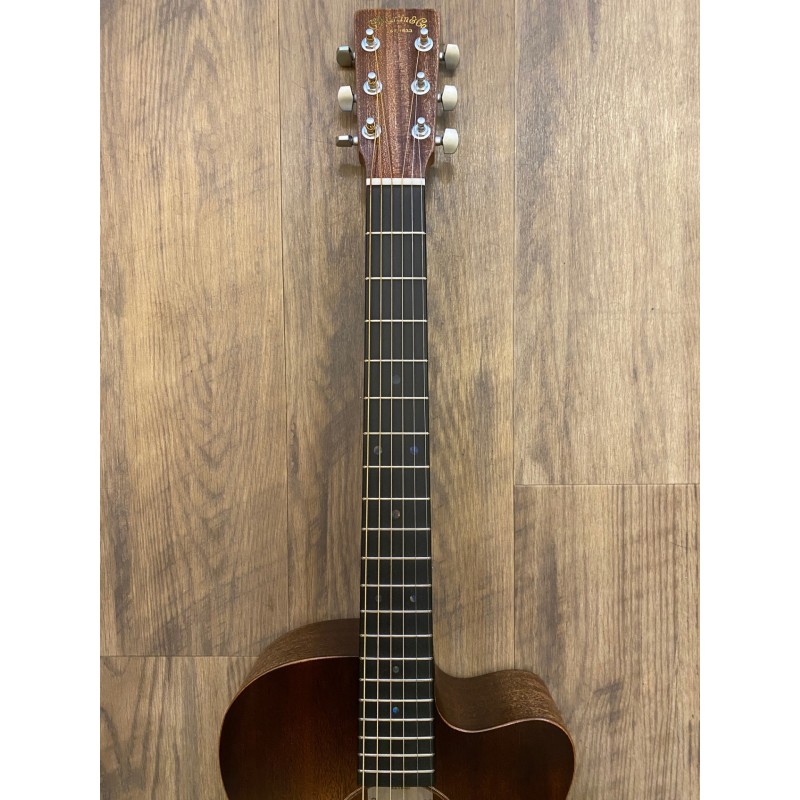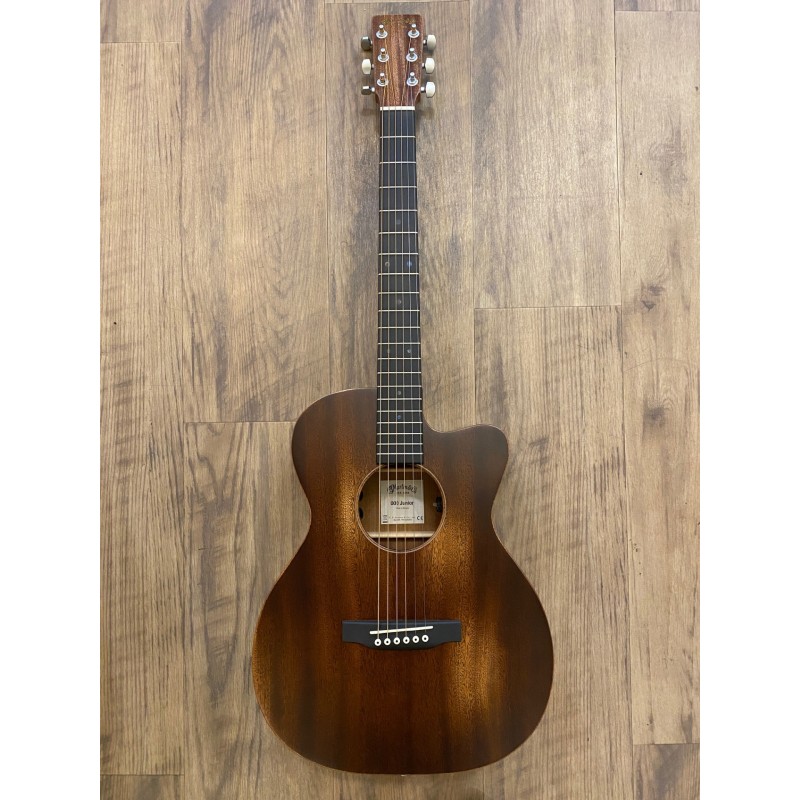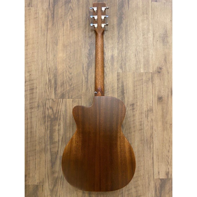 Forme 000C avec pan coupéTable en sapeleFond et éclisses en sapeleManche en acajouTouche en ébèneSillet de tête en corian blancDiapason: 632 mm20 frettesLargeur au sillet: 44,5 mmChevalet en RichliteSystème de micro Martin E1Cordes Light MA540TCouleur: Dark Mahogany Distressed