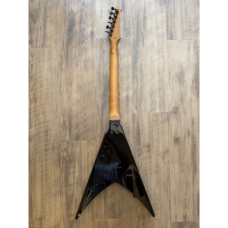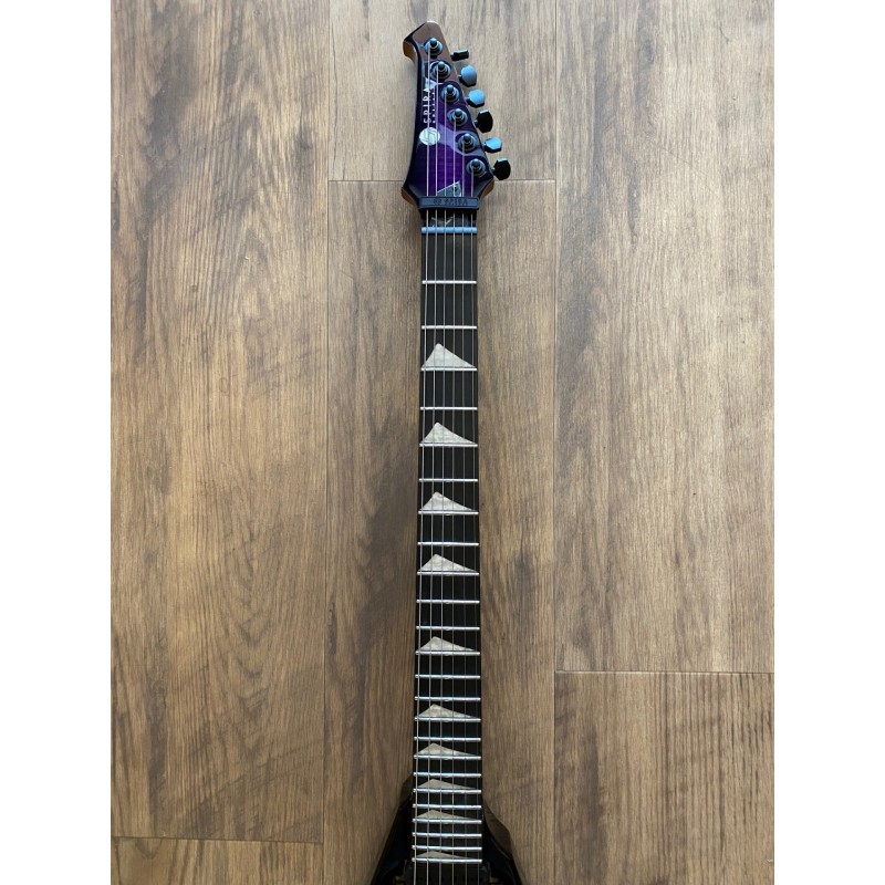 Corps : Peuplier torréfié Finition : Trans PurpleSilhouette : FlyingManche : Érable canadien grilléProfil du manche : D moderneManche : Ebony Tech amélioréRayon de la frette : 14"Nombre de frettes : 24 JumboDiapason : 25,5"Sillet : OsLargeur du sillet : 43 mm, 48 mm sur les modèles à 7 cordesBarre de réglage : Double actionMécaniques : Noir, verrouillableMicros : HH, Spira Villain, Custom Made, 12k Output, Ceramic MagnetChevalet : Fixe, String-Through HardtailCommandes : 1 volume, 1 tonalitéCouleur de l'accastillage : noir
